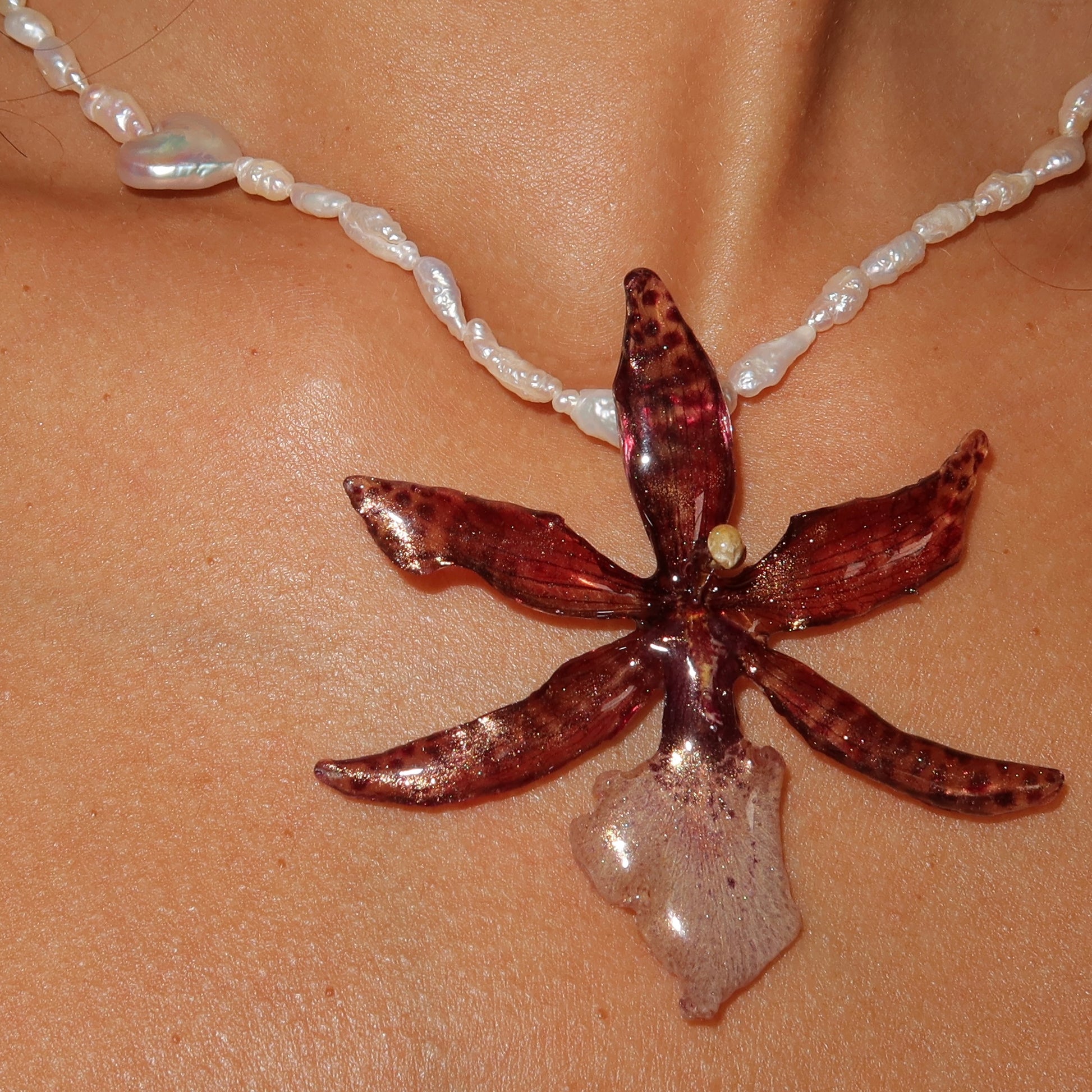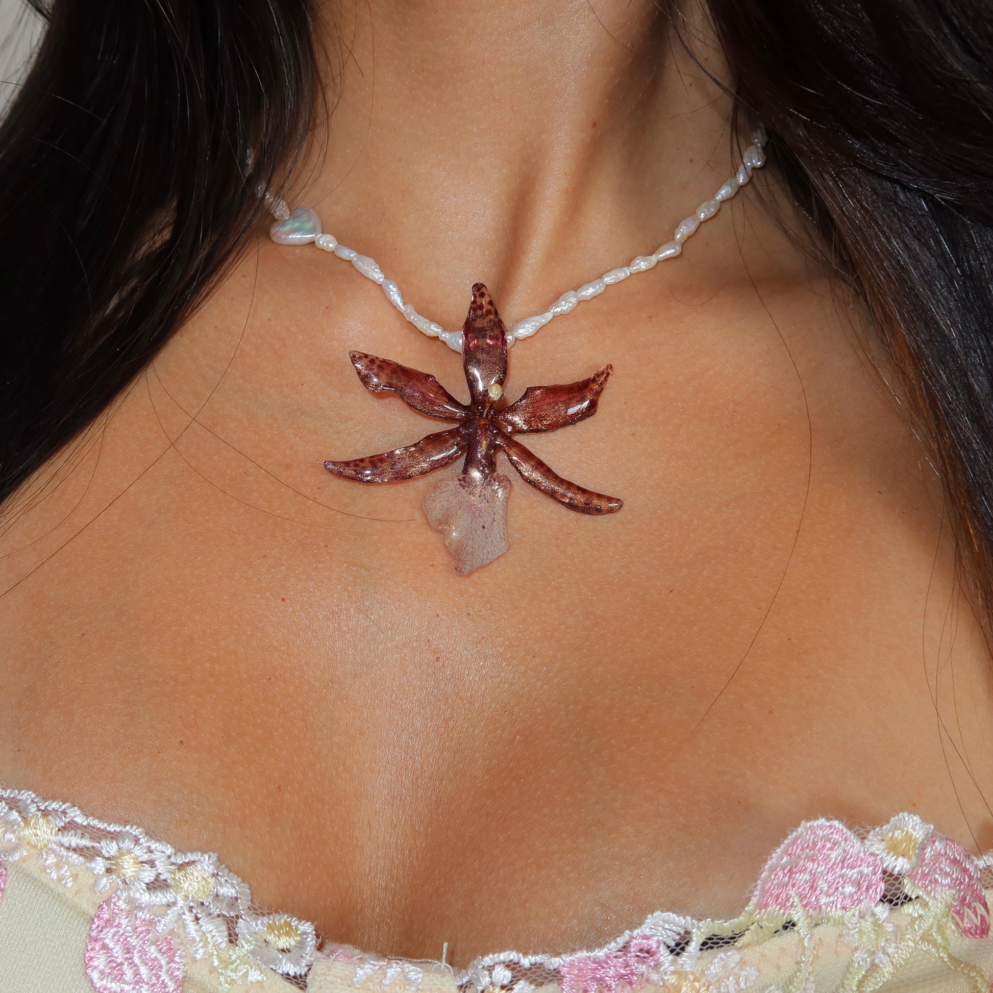 Collar de orquídea preservada en resina, previamente secada, compuesto por perlas semipreciosas y barrocas, cierre de plata 925.