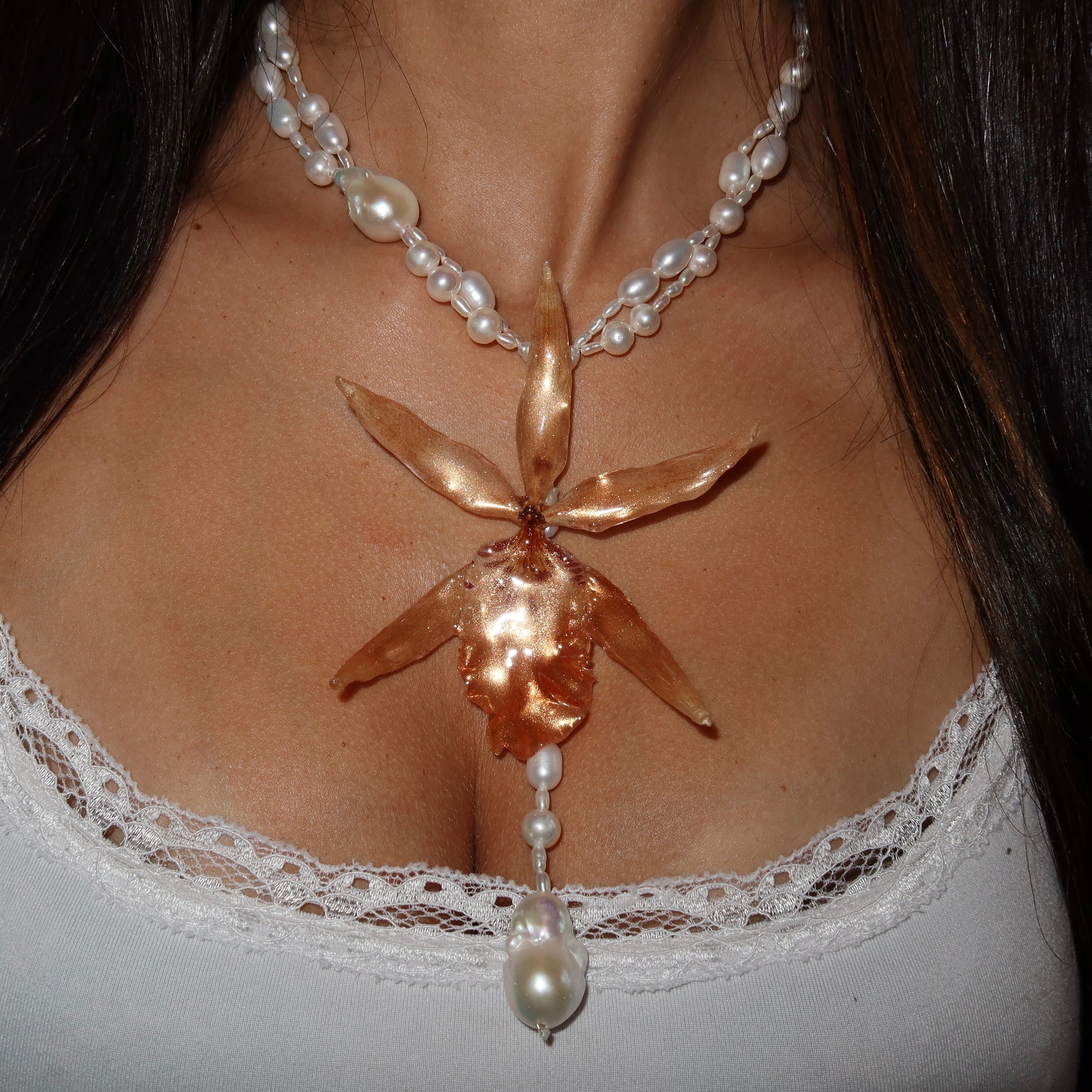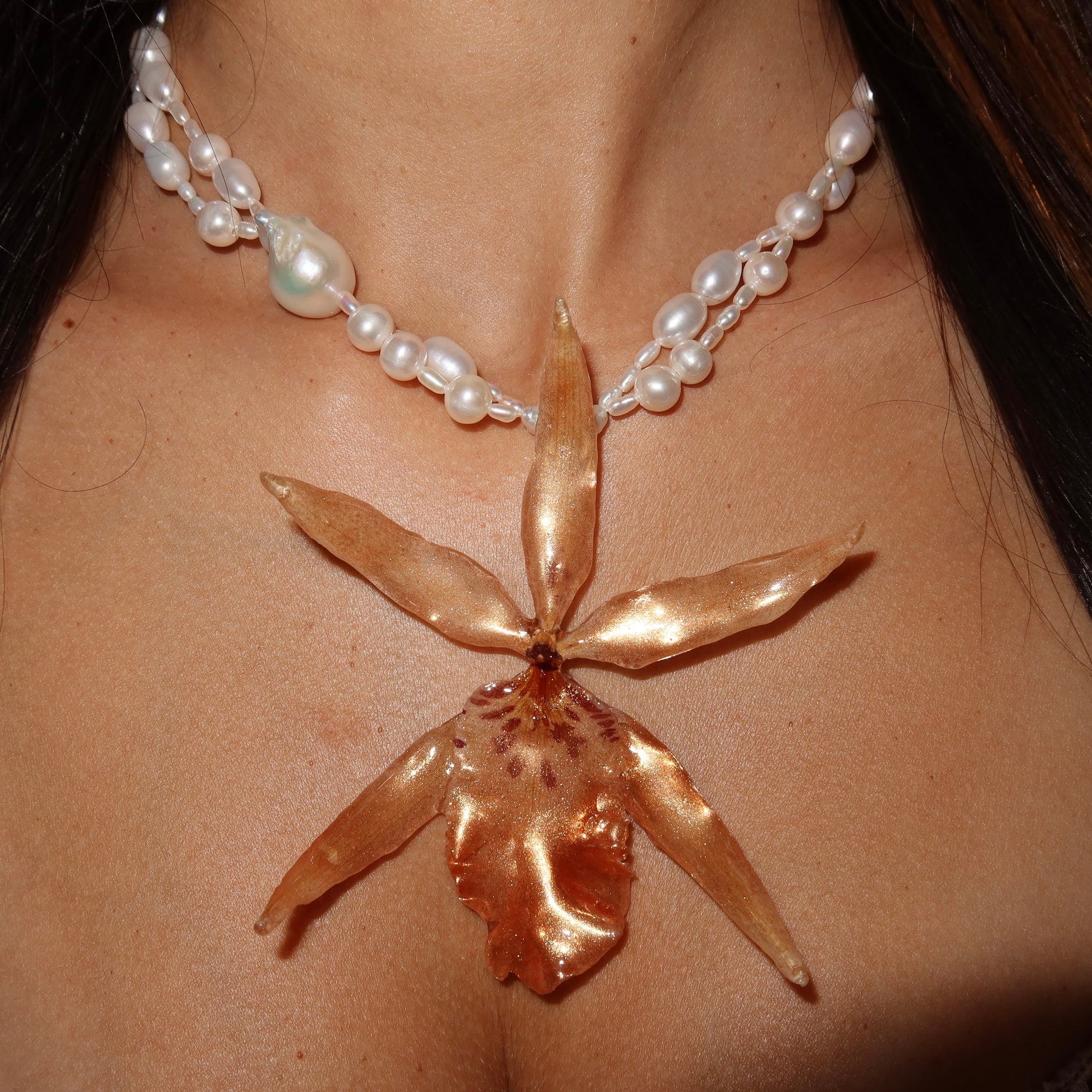 Collar de orquídea preservada en resina, compuesto por perlas semipreciosas de calidad AAA, perlas barrocas AAA, con accesorio removible, cierre de plata 925.
