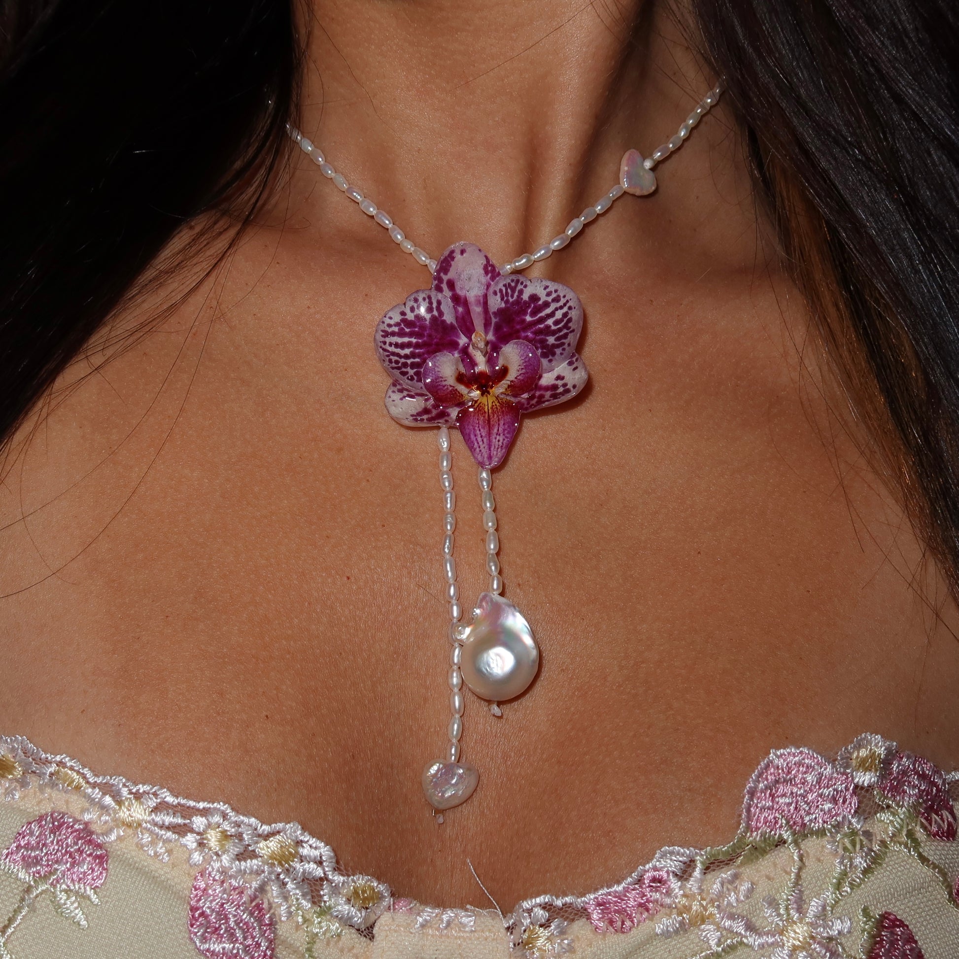 Collar de orquídea preservada en resina, previamente secada, compuesto por perlas semipreciosas de calidad AAA y barrocas, cierre de plata 925. ACCESORIO DE ABAJO REMOVIBLE.