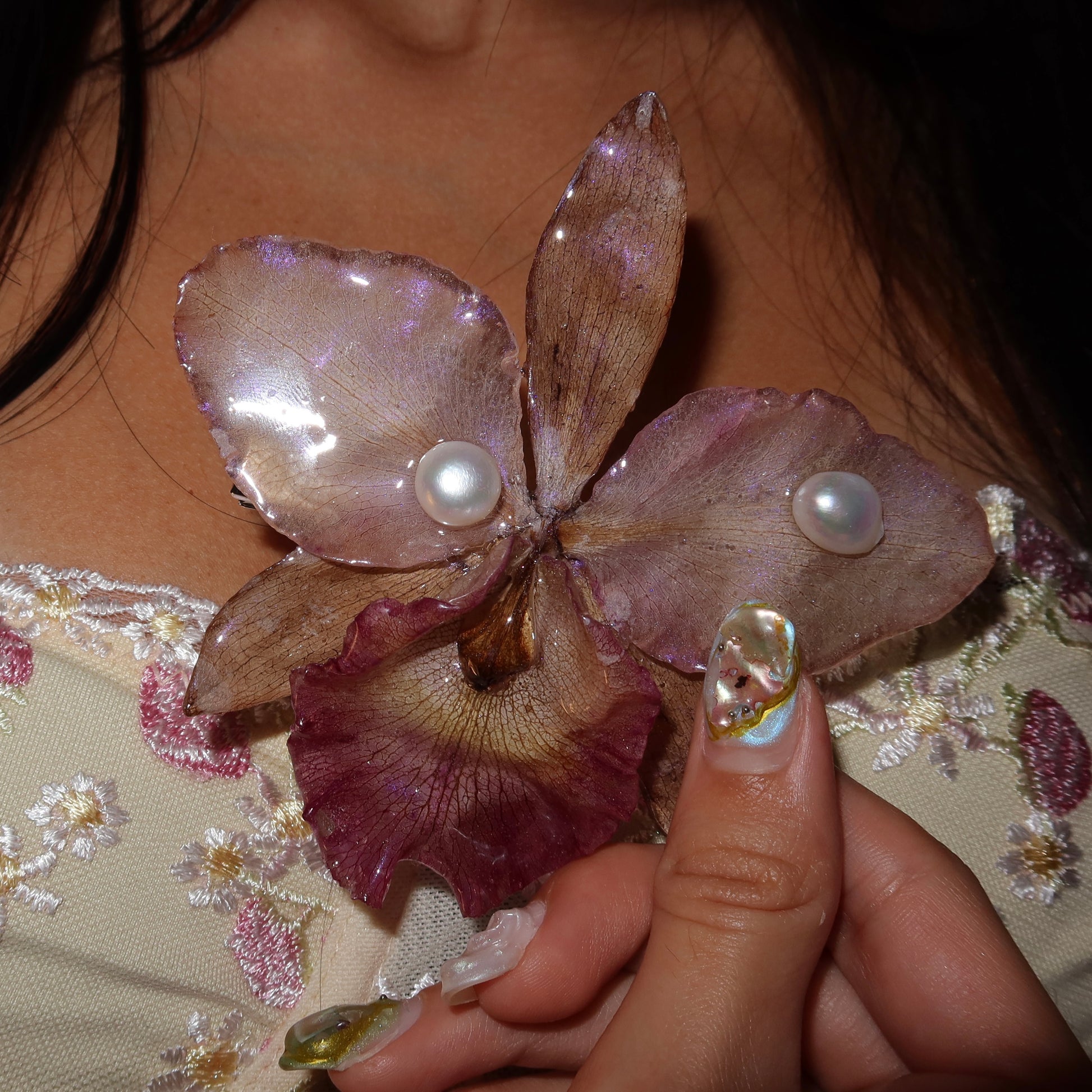 Hair Clip de Cattleya preservada en resina, previamente secada, con decoración de perlas semipreciosas.