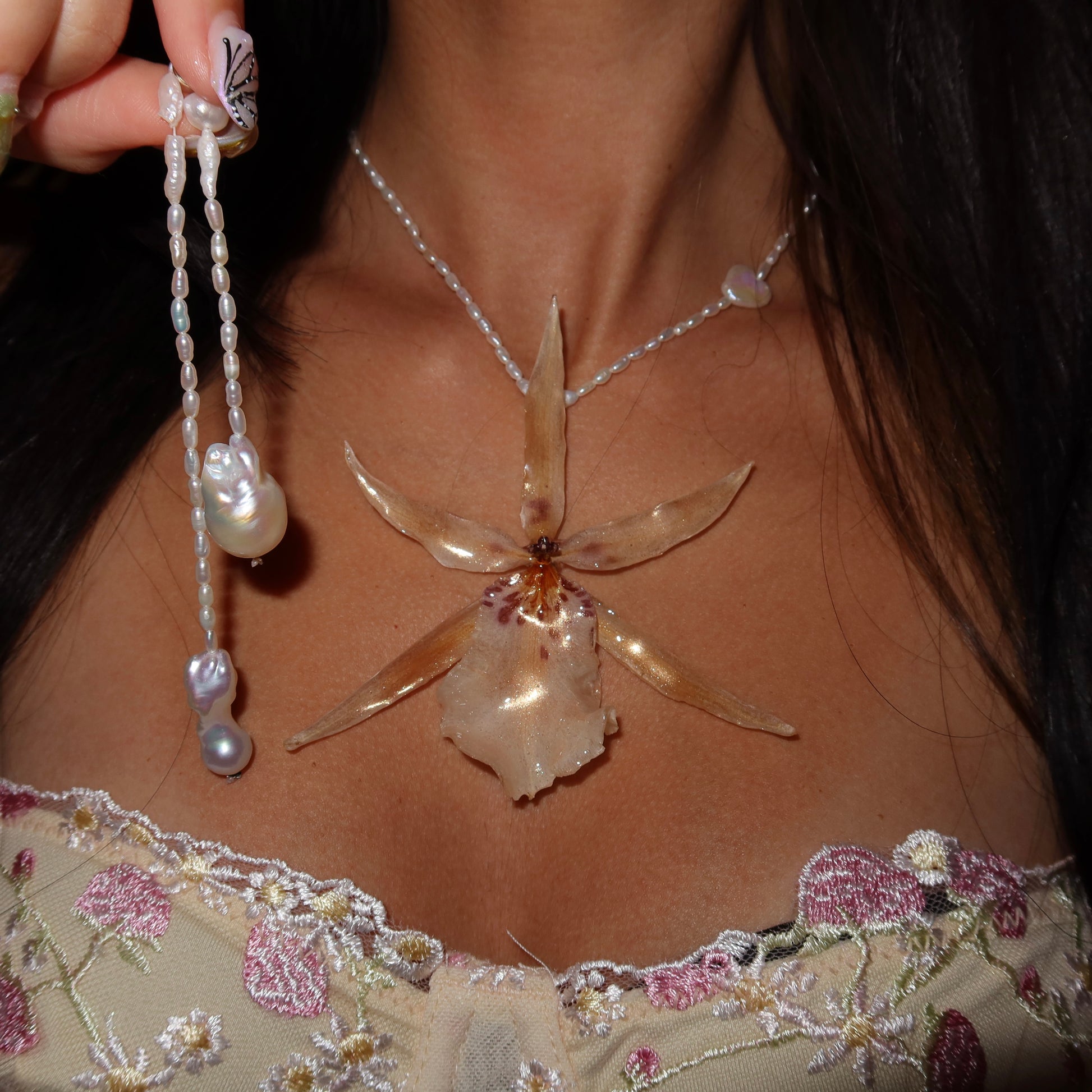 Collar de orquídea preservada en resina, previamente secada, compuesto por perlas semipreciosas de calidad AAA y barrocas, cierre de plata 925.