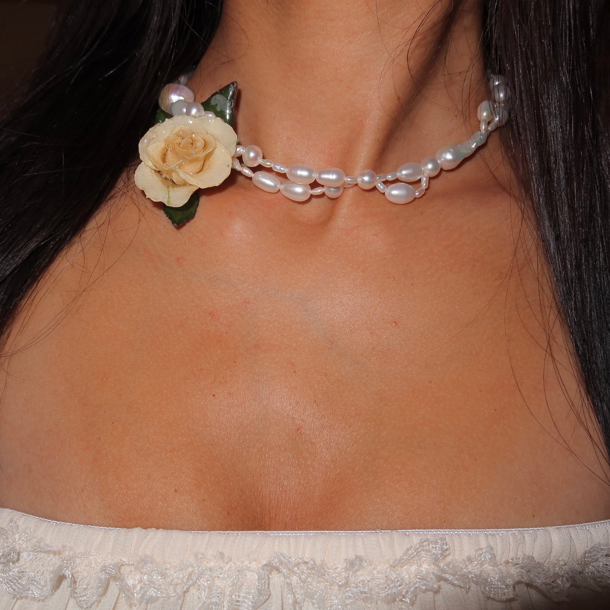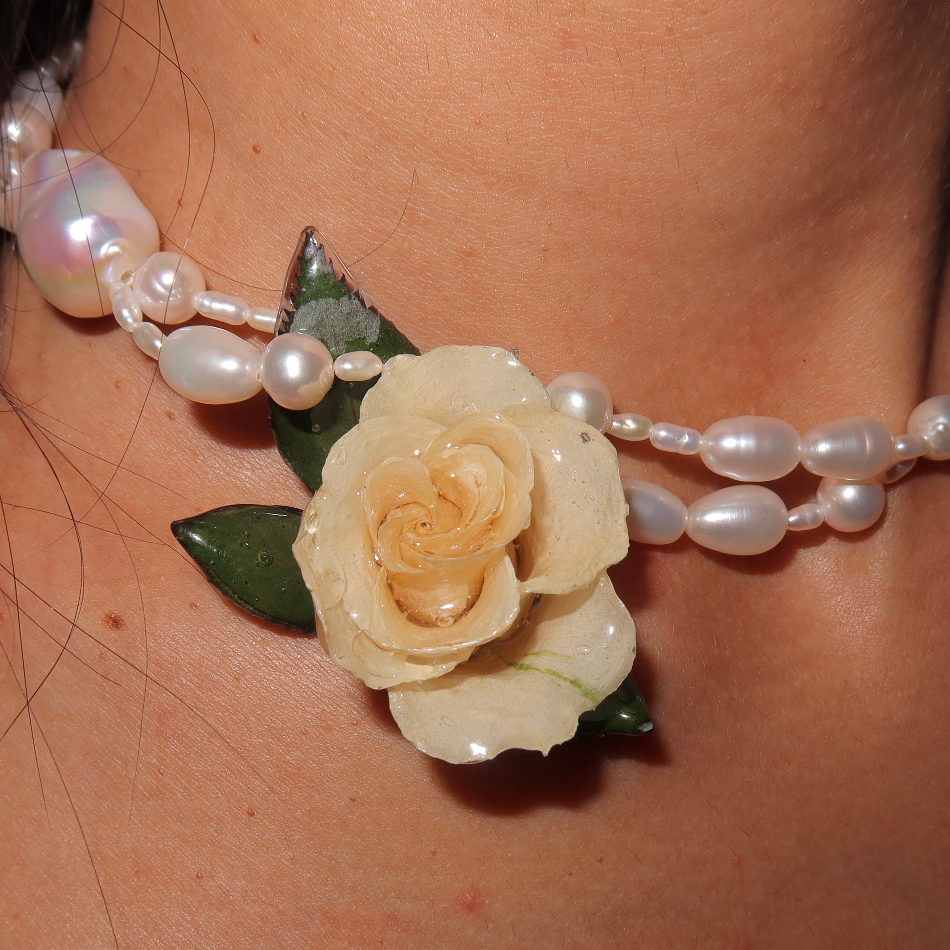 Collar de rosa pequeña previamente seca y posteriormente encapsulada en resina, collar compuesto en su totalidad por perlas semipreciosas de calidad AA y AAA, cierre de plata 925.