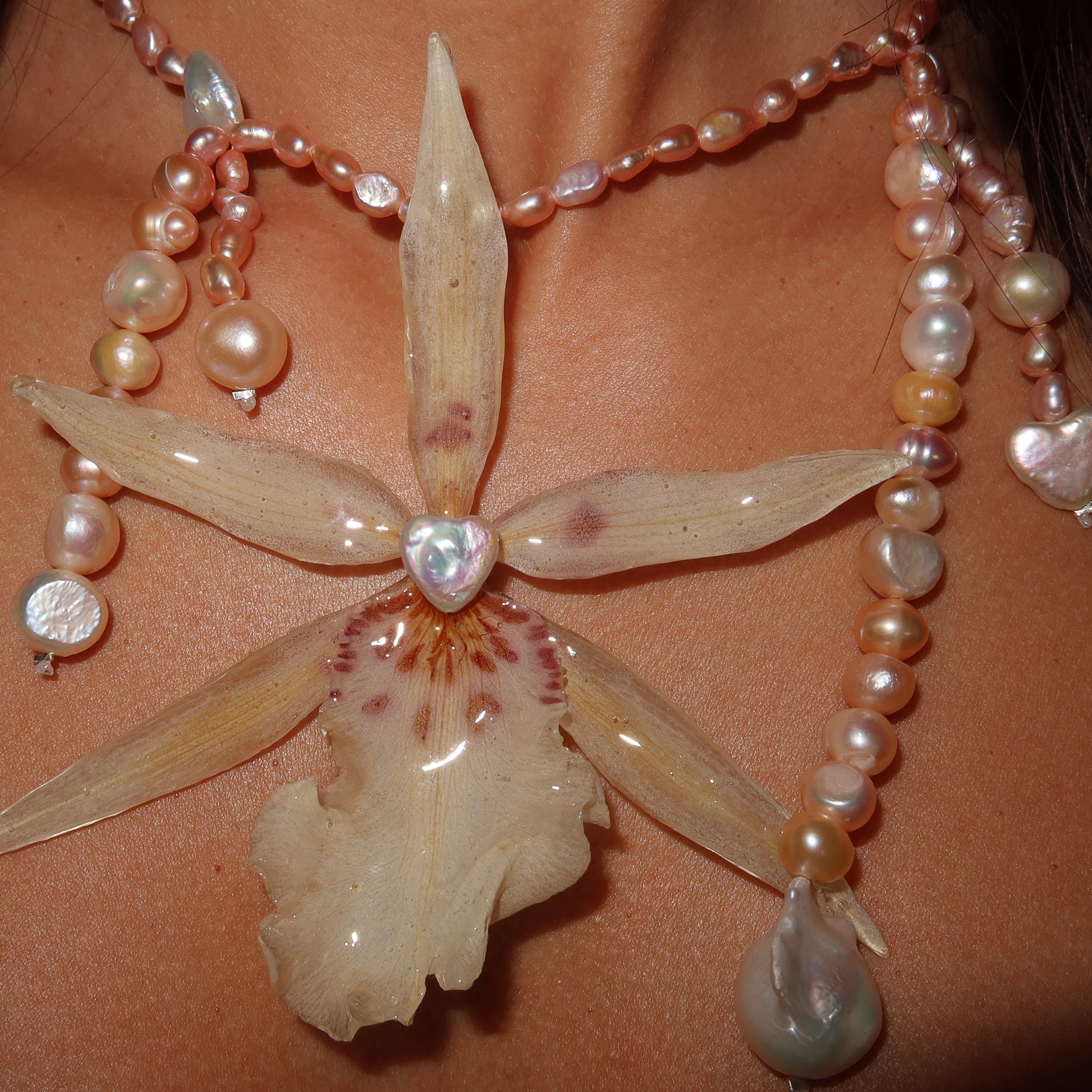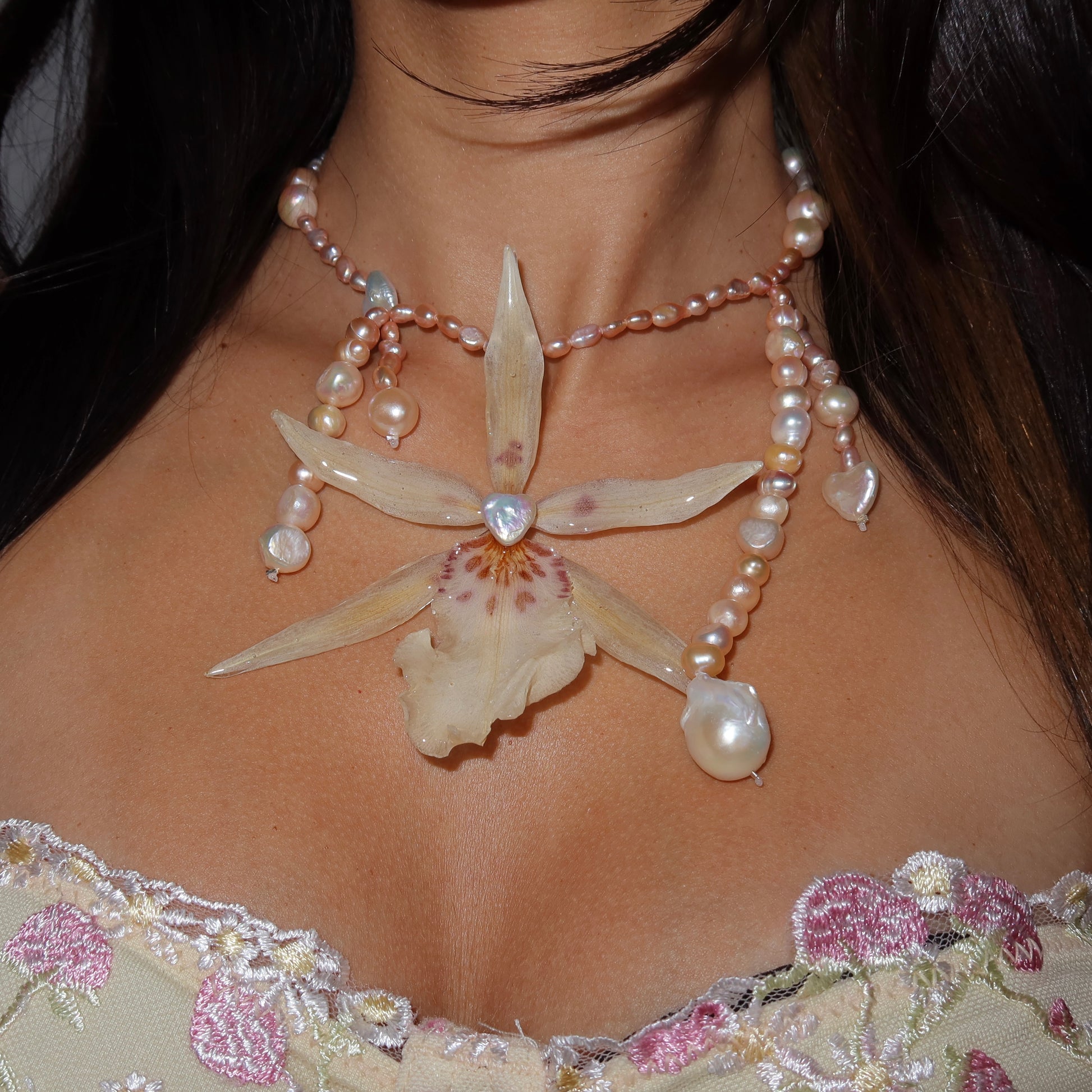 Collar de orquídea preservada en resina, previamente secada, compuesto por perlas semipreciosas y barrocas, cierre de plata 925.