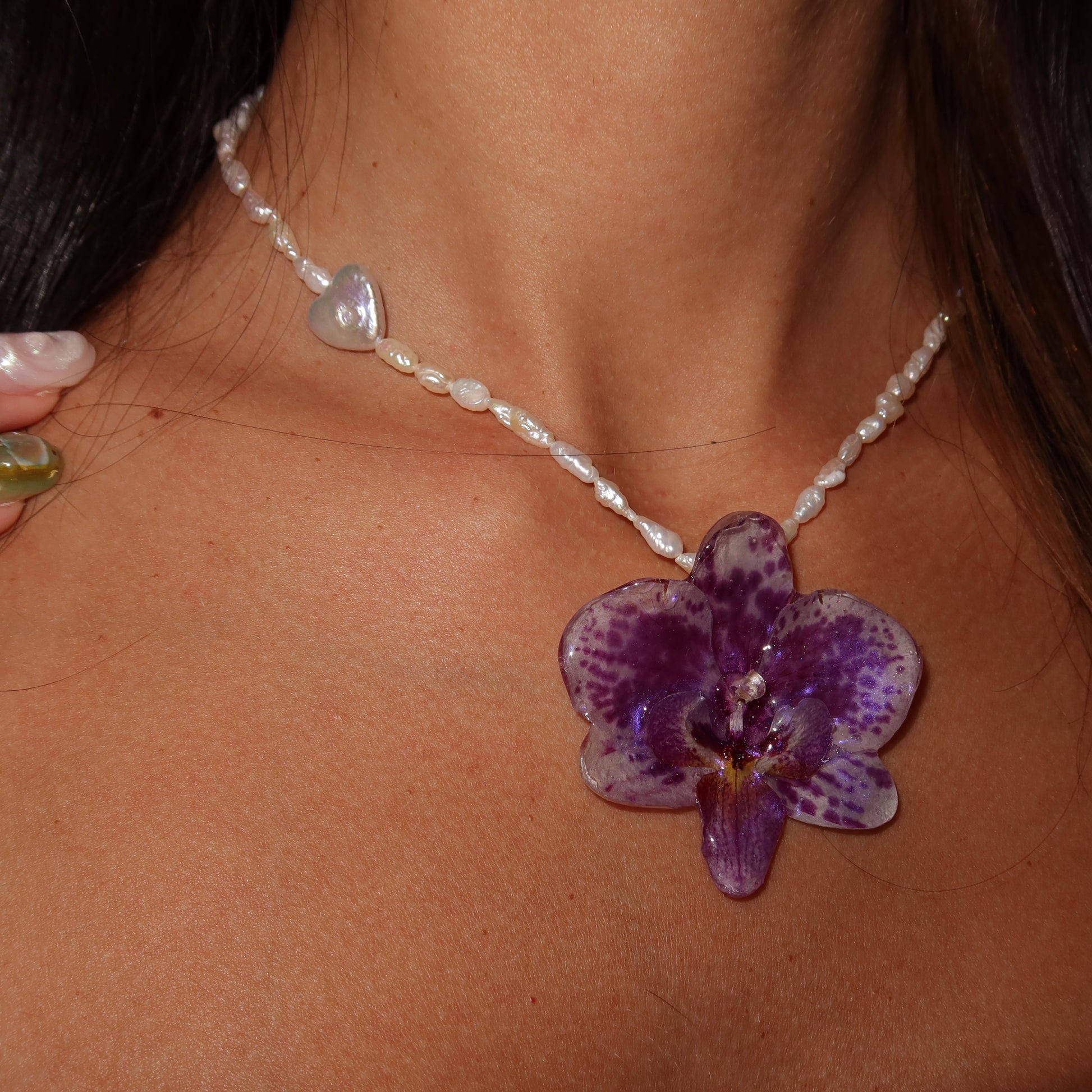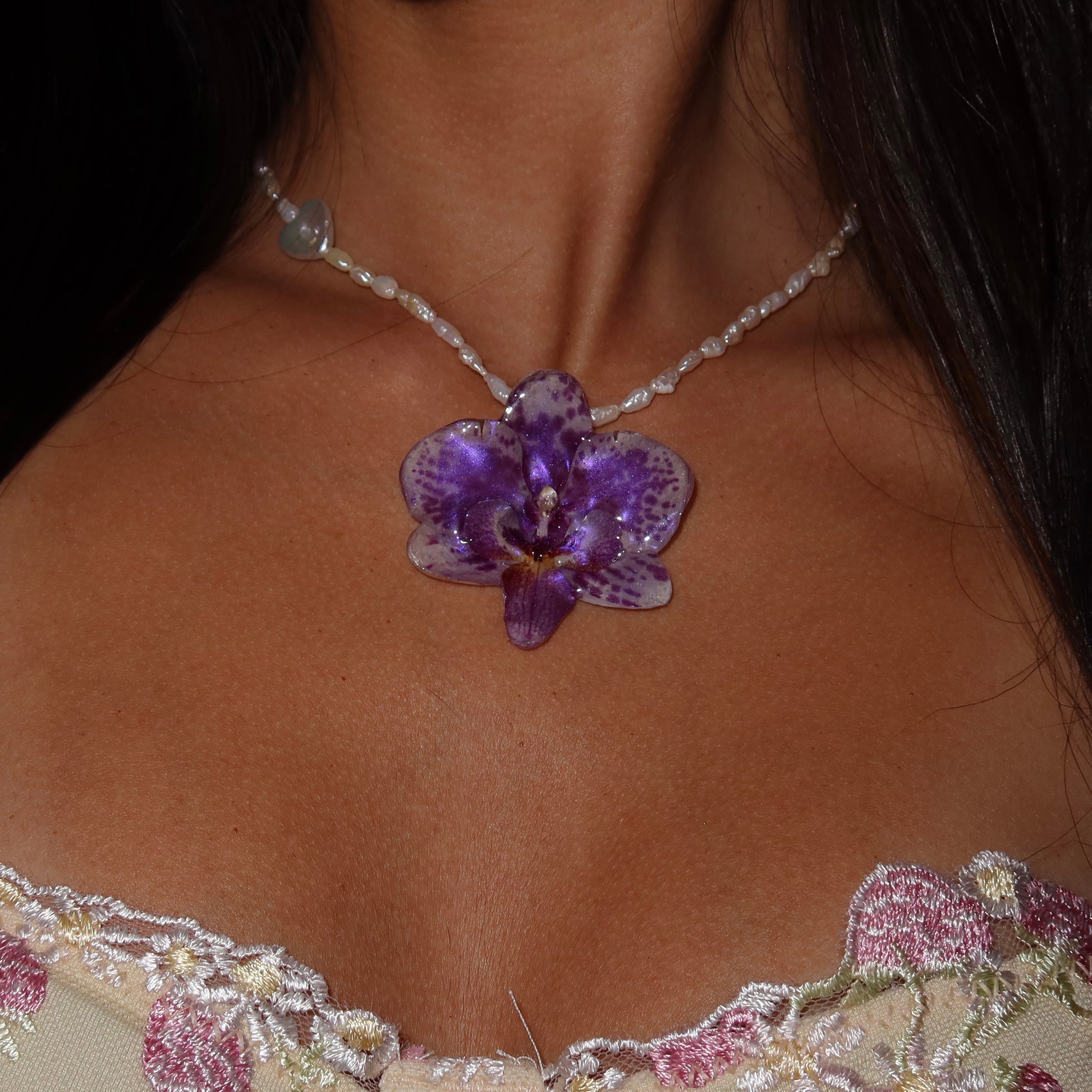 Collar de orquídea preservada en resina, previamente secada, compuesto por perlas semipreciosas y barrocas, cierre de plata 925.