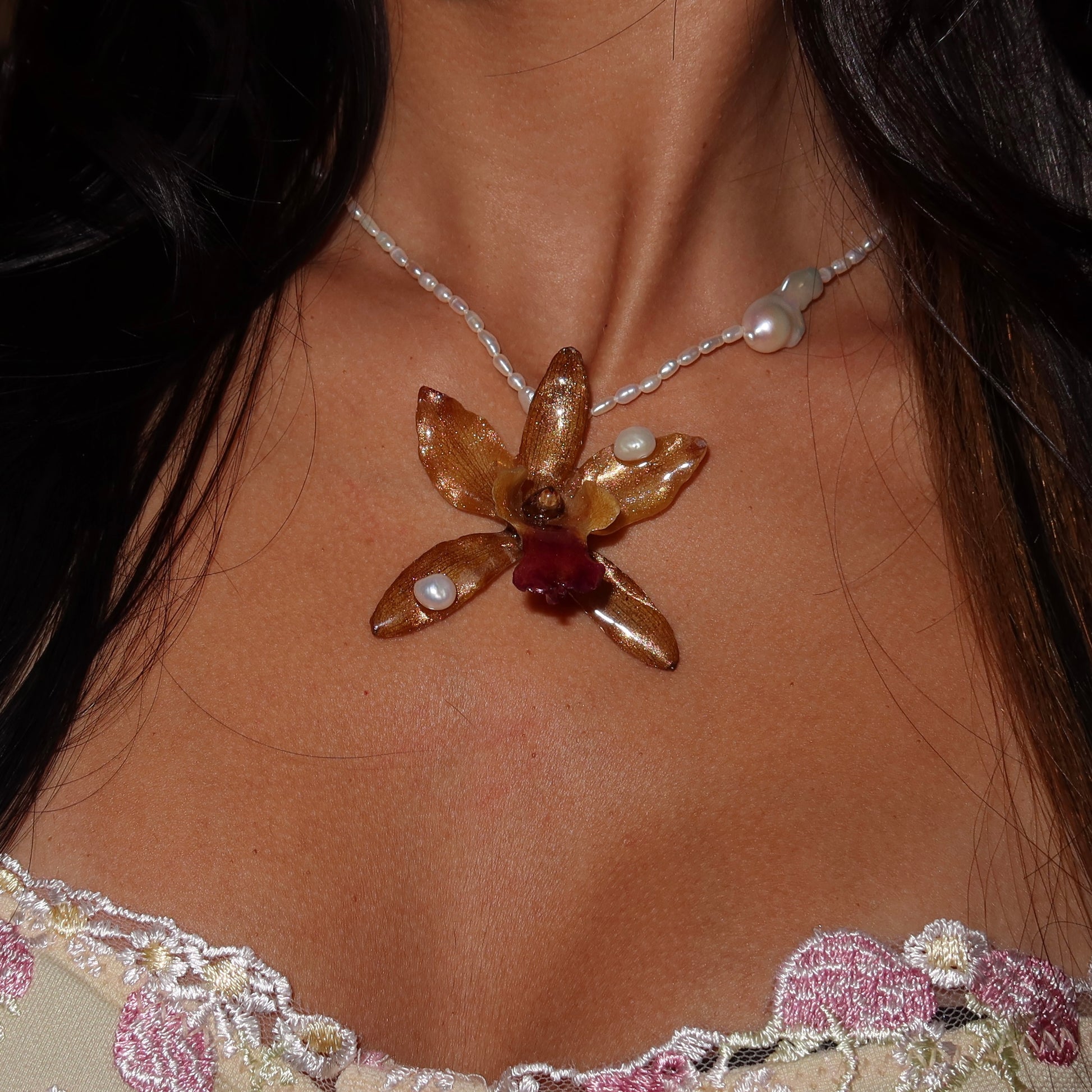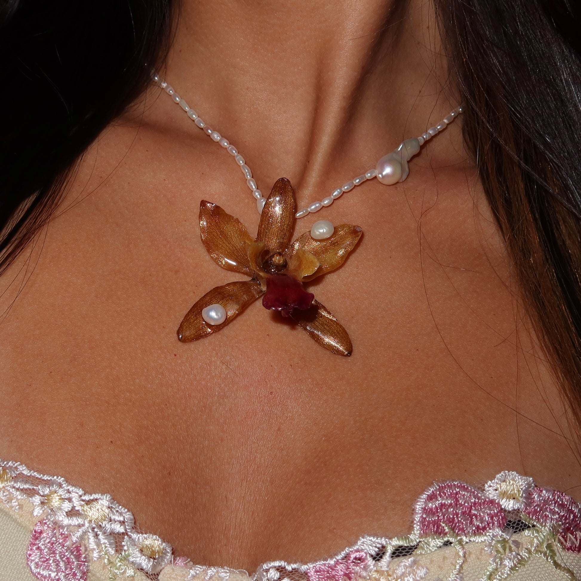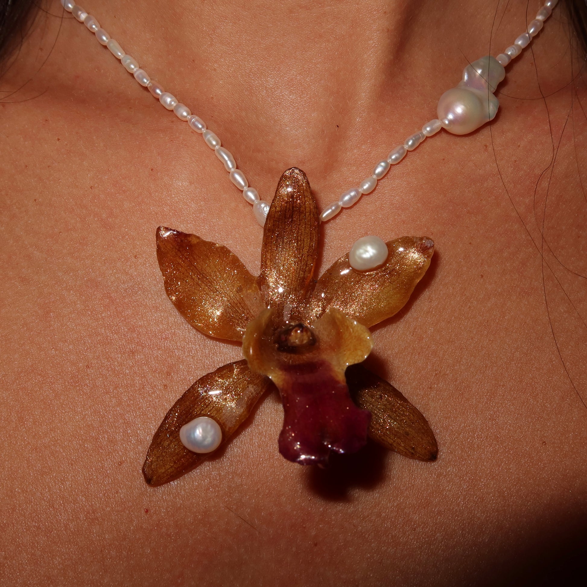 Collar de orquídea preservada en resina, previamente secada, compuesto por perlas semipreciosas de calidad AAA y barrocas, cierre de plata 925.