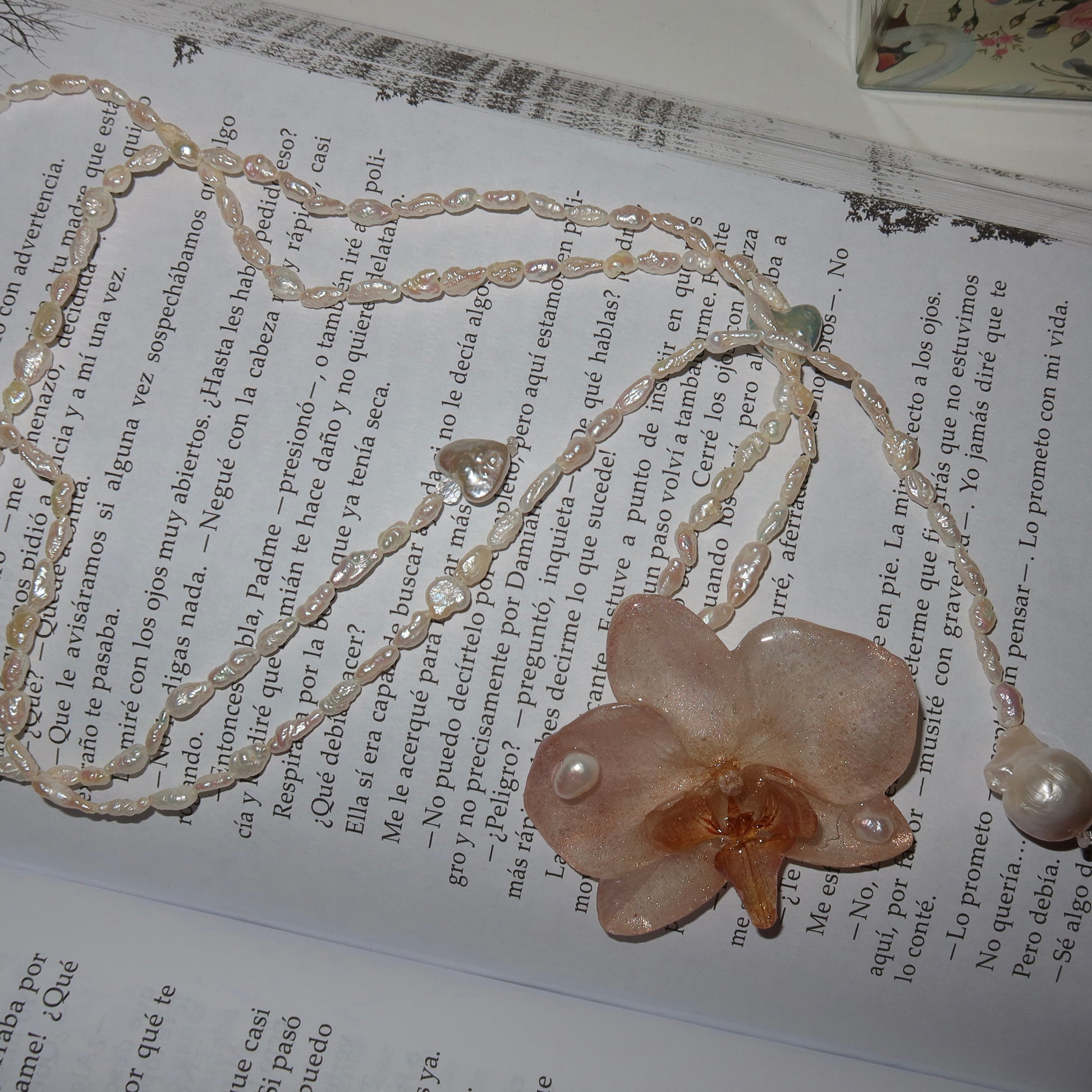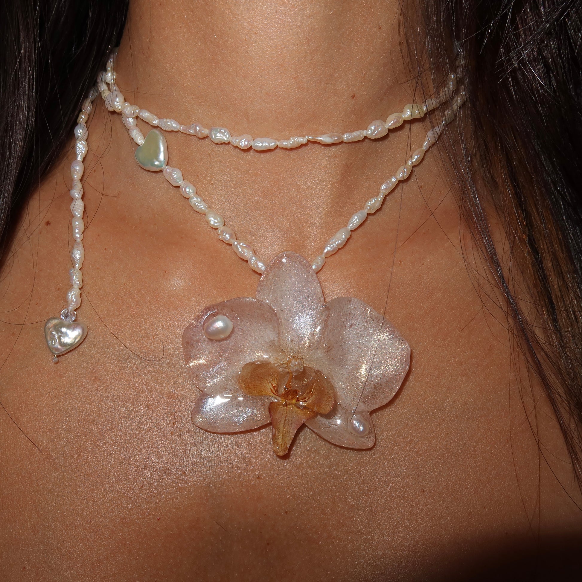 Collar de orquídea preservada en resina, previamente secada, compuesto por perlas semipreciosas y barrocas.