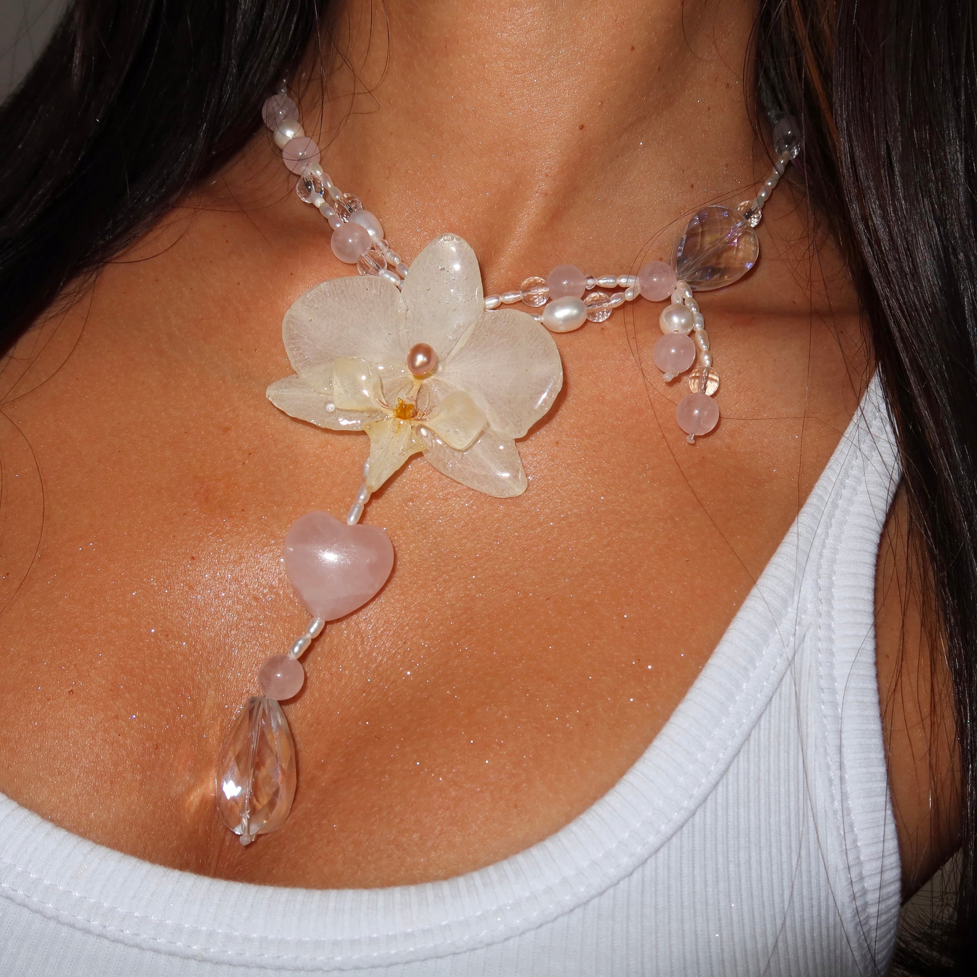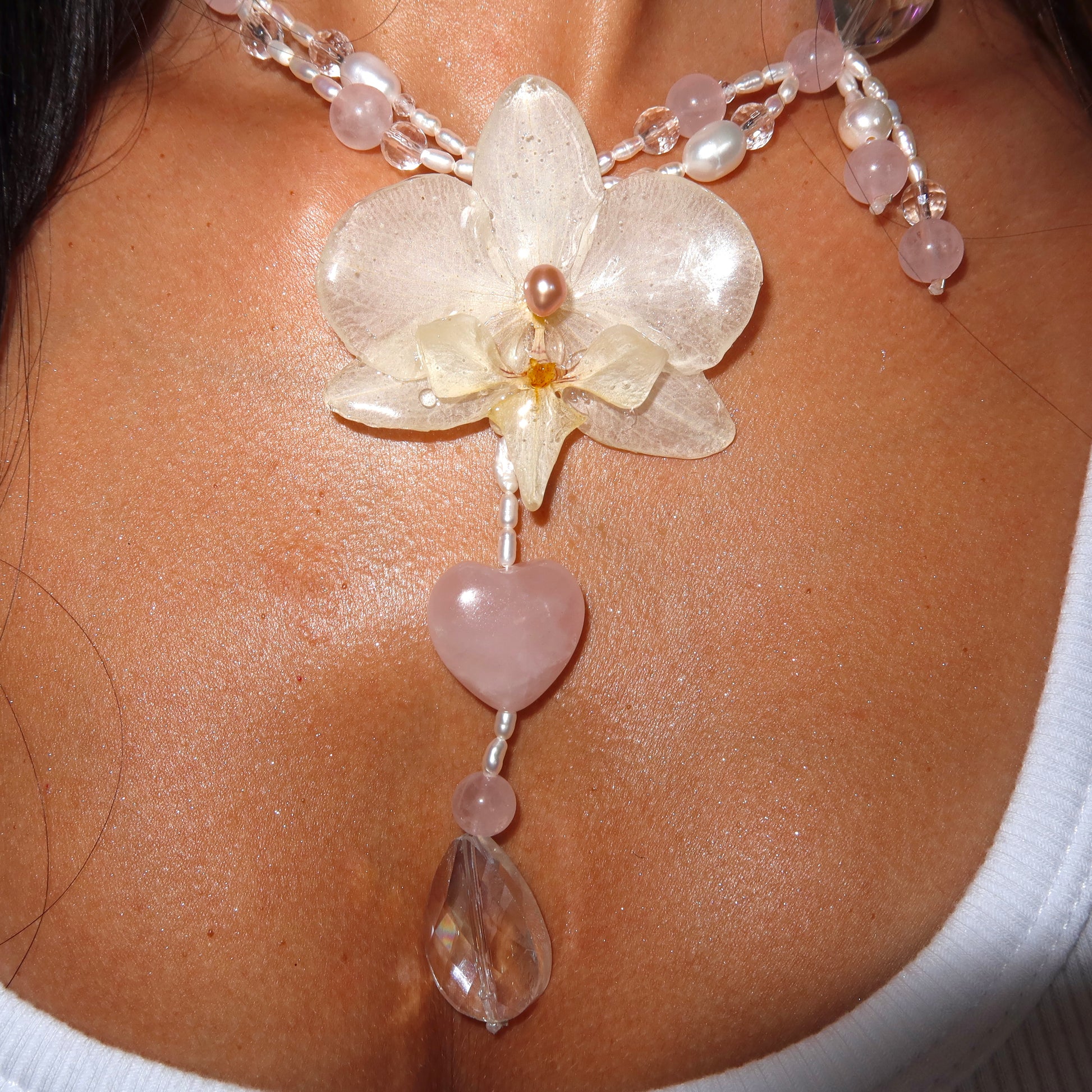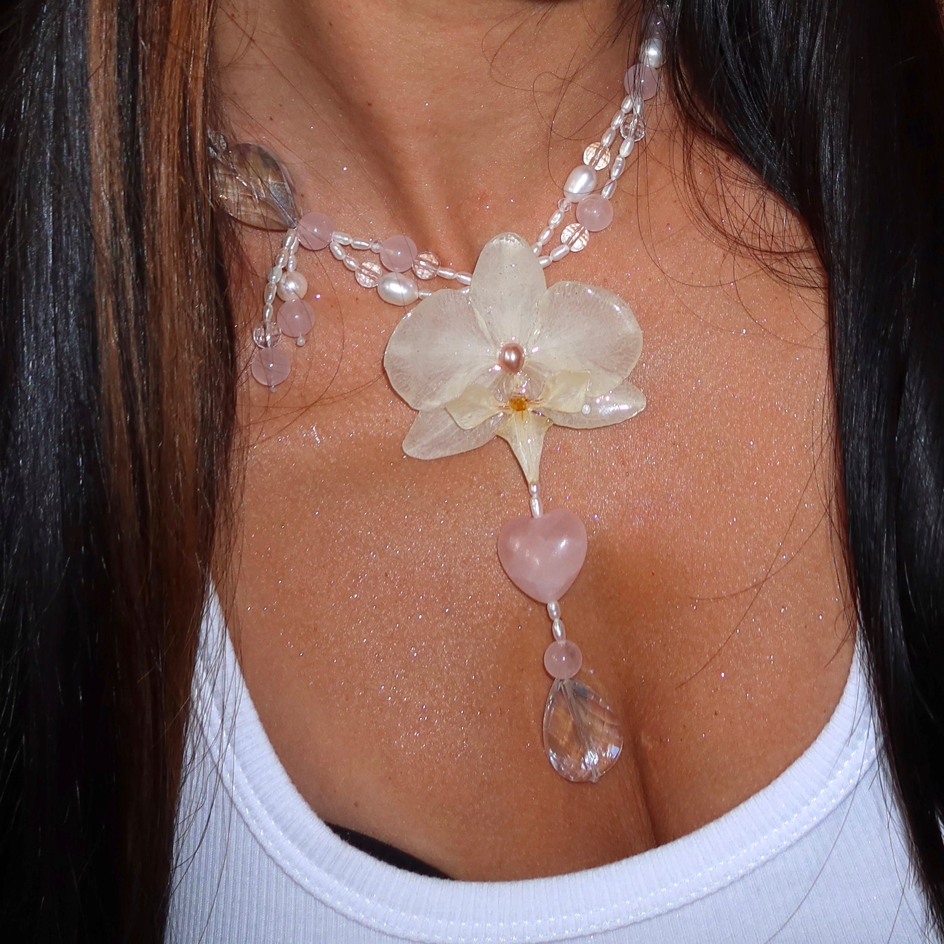 Collar de orquídea preservada en resina, compuesto por perlas AAA, cuarzo rosa y cristal 💕 cierre de plata 925.